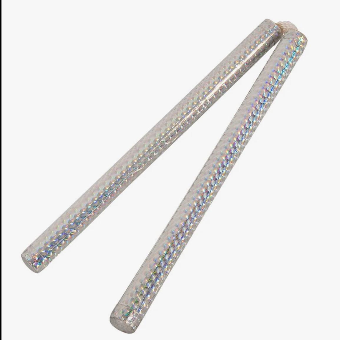 These eye-catching nunchaku are constructed of wood and covered with silver holographic prism film. Features a 1-inch nylon cord attachment.Diameter: 0.875".